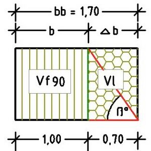When calculating the angles, it must be taken into account that a wet soil slides faster than a dry soil, i.e. the wet soil’s inclination angle is reduced. Consequently, water volume Vw and its width bw must be calculated first. The water volume results from Vw = pwg ∙ (^b ∙ h ∙ a) / ptg90 = 1.0 ∙ (0.70 ∙ 1.0 ∙ 1.0) / 3.0 = 0.233 m³ and has a width of bw = 0.233 m.