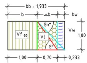 The same result is obtained with the soil band (Fig. 4). Here, angle ßt is calculated using the volume ratio of the solid rock mass Vf90 = 1.00 m³ and the fictive pore volume Vl = h ∙ a ∙ ^b, whereby width ^b = Vl / = 0.412 / 0.588 = 0.70 m is represented. Or inclination angle tan ßt = h / ^b = 1.0 / 0.70 = 1.427 ⟶ ßt = 55.0°.