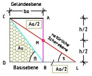 The inclination angle is calculated from tan ßn = h /(^b + bw) = 1.0 / (0.70 + 0.233) = 1.072 ⟶ ßn = 47.0°. The resulting shear angle is tan sn = tan ßn /2 = 1.072 /2 = 0.536 ⟶ shear angle sn = 28.2°.