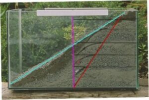 In der eigenen „Studie zum Erddruck“ wurde belegt, dass die Höhe des horizontalen Kraftangriffs gegen die Wand durch die anstehende Bodenart vorgegeben wird, d.h. dieser sich nicht auf eine vorgegebene oder gewählte Höhe festlegen lässt. Um diese These zu bestätigen, wurde in der Studie die Versuchsanordnung 4 (Abb. 5) durchgeführt. Hierzu wurde in die rechte Kammer des benutzten Glaskastens schichtweise Basaltgrus eingebaut und Papierstreifen zwischen den Schichten eingelegt. Nach dem Ziehen der arretierten, aber lose eingestellten Glasscheibe konnte kein Kraftfluss im unteren Drittel der Keilhöhe festgestellt werden. Weitere Versuchsanordnungen offenbarten, dass die Eigenschaften von Böden, wie Dichte, Reibungs- und Scherwinkel errechenbar sind und diese Werte die Größe der Erddruckkraft und ihre Höhe gegen die Wand bestimmen. Eigene Literatur ist abrufbar unter: erddruckgiesler.de.